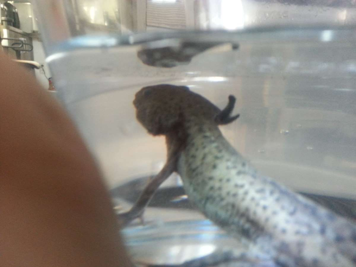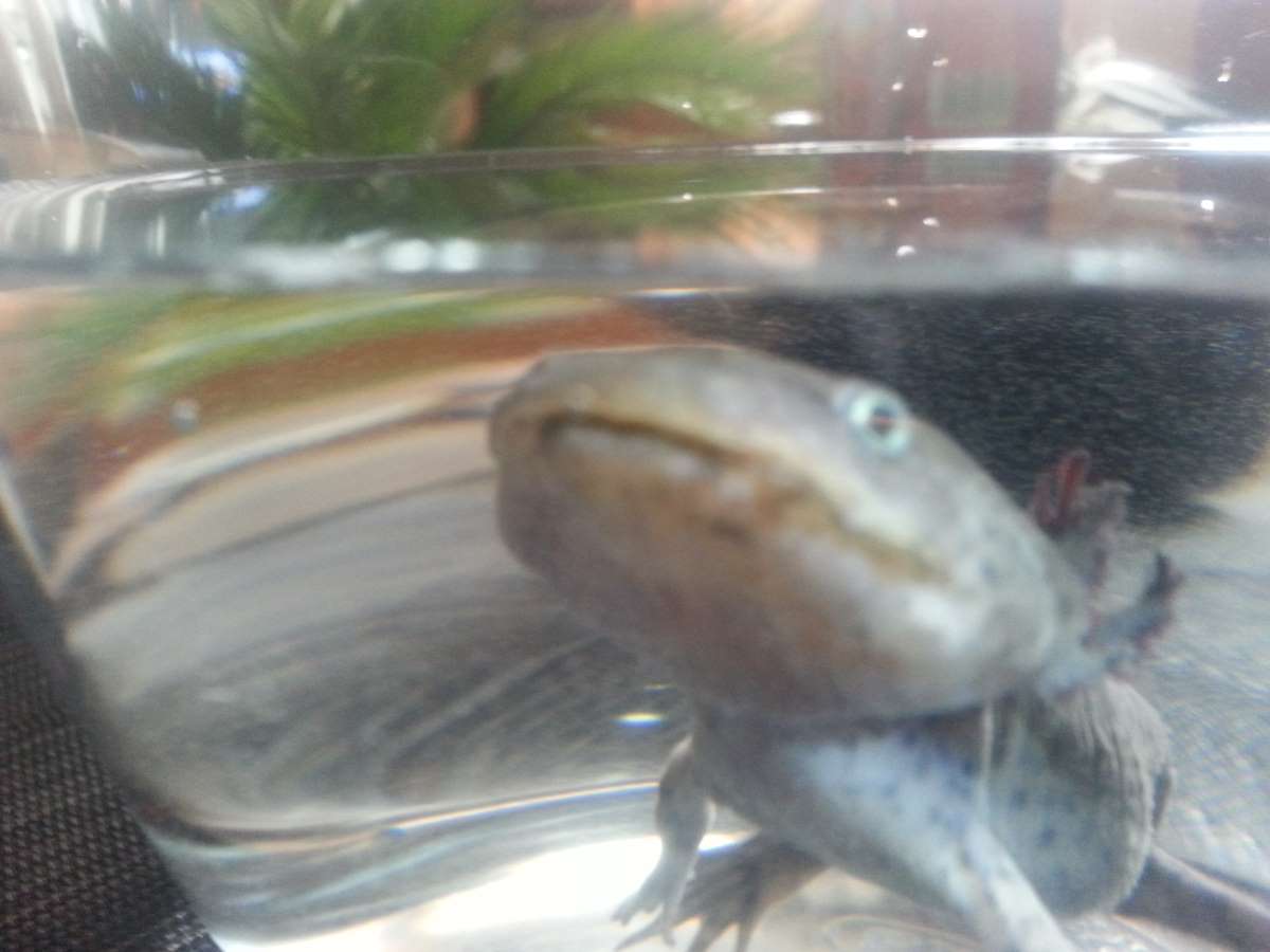 Letztes Jahr im August war ich übers Wochenende mal nicht zu Hause, als ich dann zurück kam, war ein Bein gebrochen, ein Vorderbein war zur Hälfte weg und er war sehr sehr dünn! Wir haben ihn dann per Handfütterung wieder aufgepeppelt, Bein wuchs wieder gut nach (bis auf eine Zehe) und auch das gebrochene Bein ist wieder völlig in Ordnung. Danach gabs auch einen mehr oder minder starken Wachstumsschub von 3 cm sodass wir jetzt auf etwa 11 cm stehen. In der Zeit sahen auch seine Kiemen wirklich schön aus.